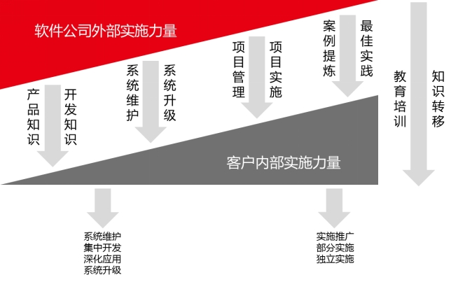 软件公司认为项目实施过程不仅是为客户建立新的应用系统,而且将是一个技术转移和知识转移的过程。通过实施工作的进行,客户将能逐步掌握平台的各种产品技术、应用行业知识和项目实施技术,从而为将来更好地使用维护本系统,为在今后系统建设中发挥主要作用打下良好的基础。